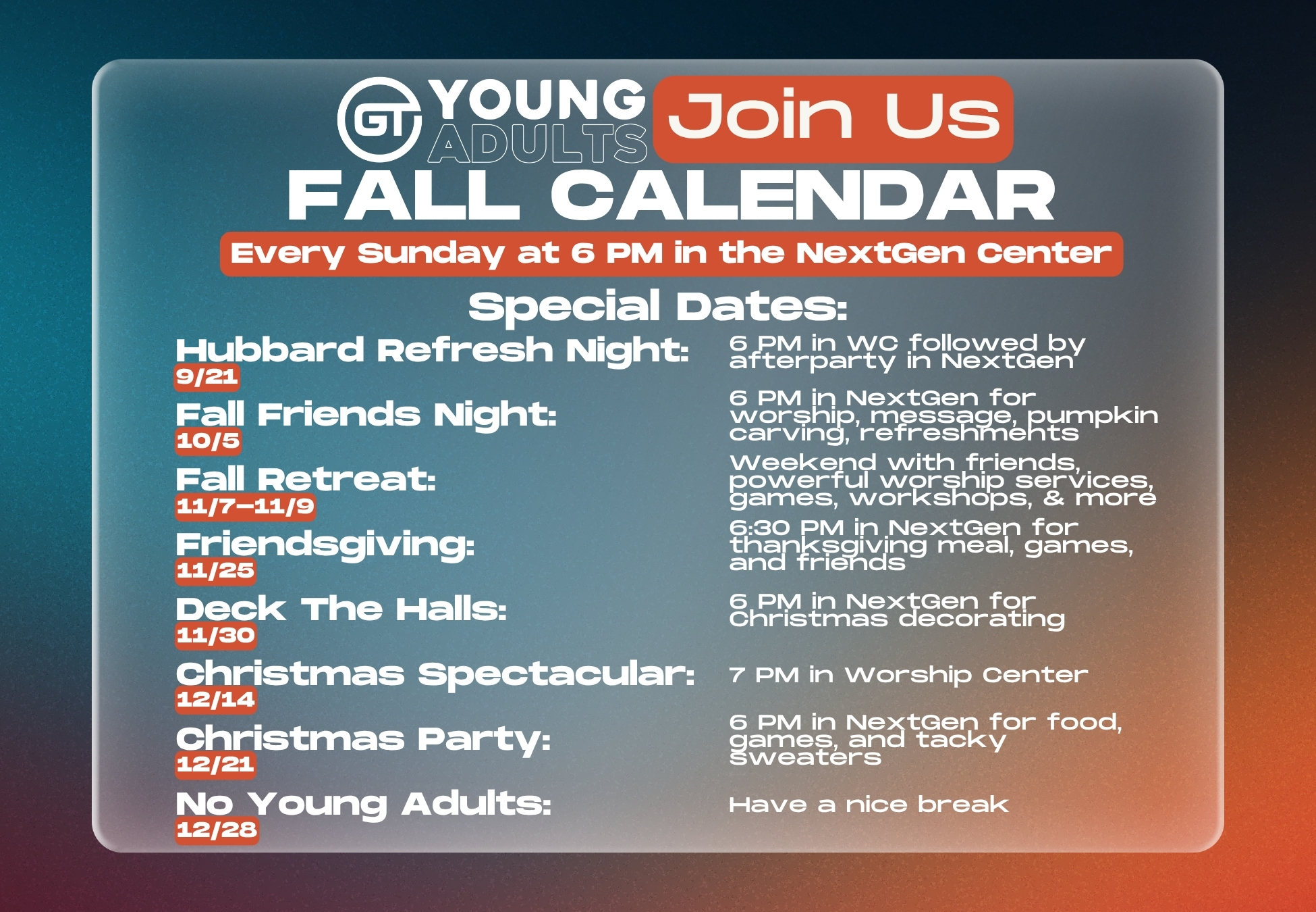 GT Young Adults exists to help 18-25-year-olds build authentic, God-centered community. Whether you’re a college student, working, or figuring out your next step, you belong here! We gather every Sunday evening from 6:00–8:00 PM in the NextGen Center for a night filled with games, worship, a relevant message, small group discussions, and time to connect. We also host fun events throughout the year to grow together and make lasting memories. Stay connected through Instagram, GroupMe, and our calendar below — we’d love to see you soon!
